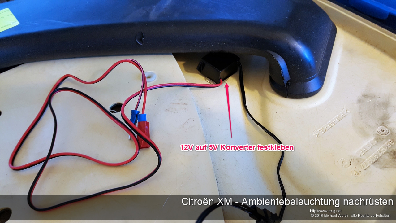 Den Konverter von 12V auf 5V klebt man an geeigneter Stelle mit Heißkleber fest, kürzt den Schlauch und steckt den „Nubsi“ wieder auf.