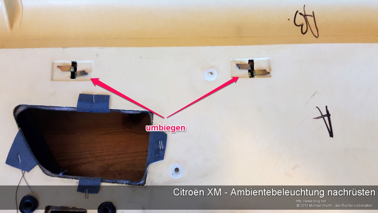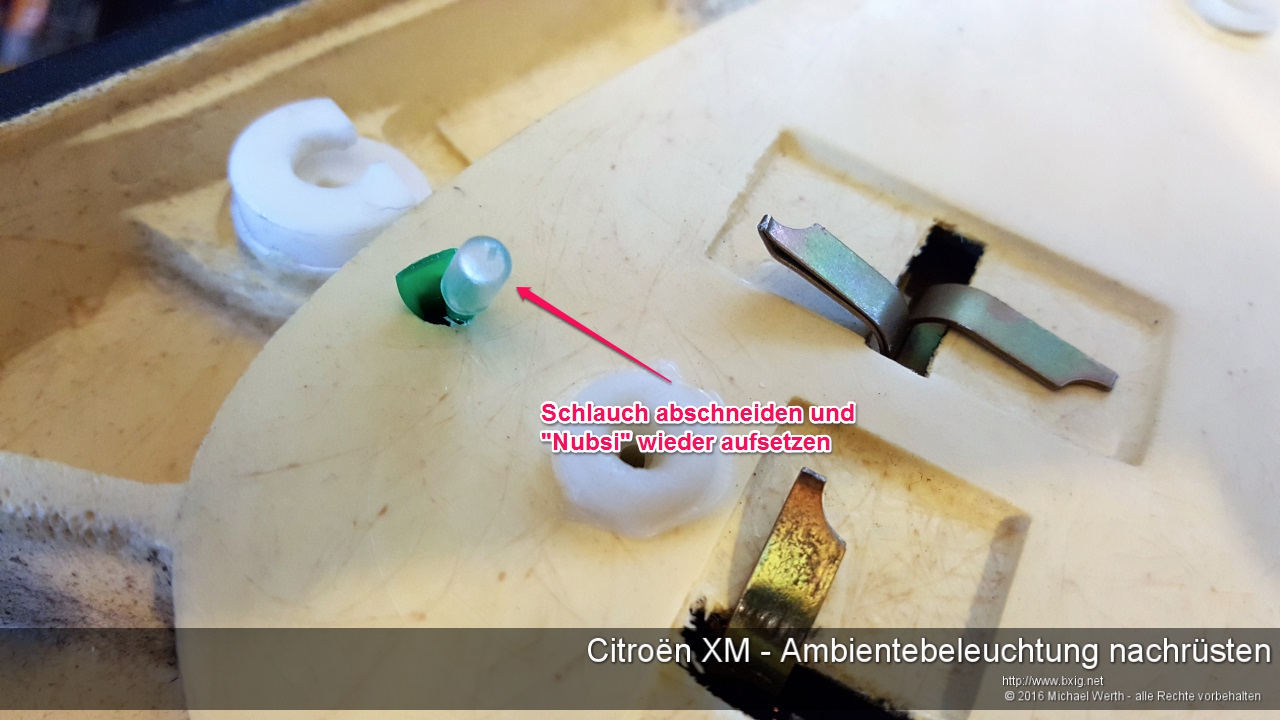 Den Lichtschlauch schiebt man nun von hinten durch eines der Löcher und durch das andere wieder nach hinten durch. Dann klemmt man den Schlauch zwischen Zierleiste und Verkleidung fest. Wer will kann auch ein wenig Heißkleber verwenden.