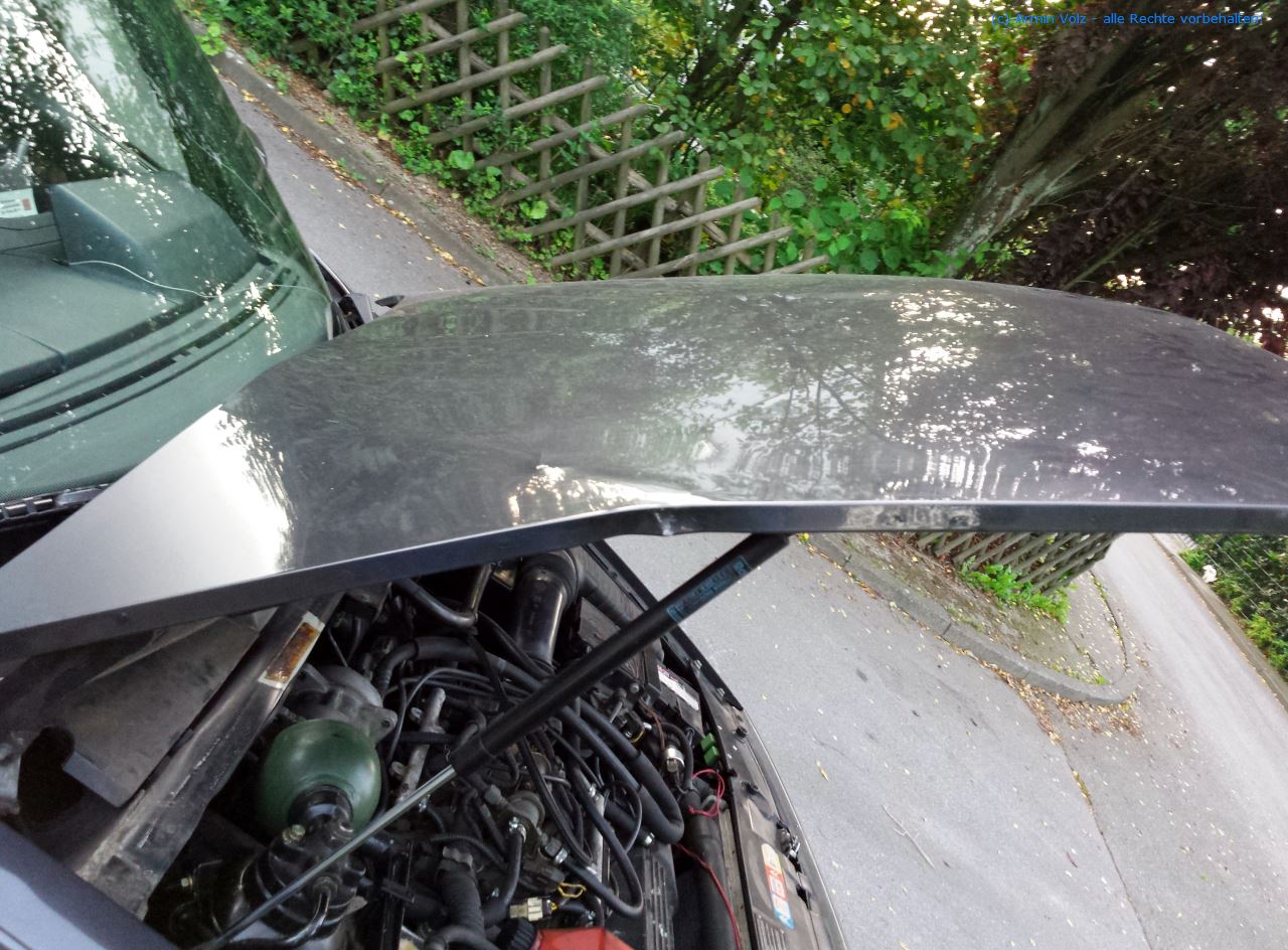 Mir ist ein leichtes Quietschen vorne rechts beim Einfedern aufgefallen. Irgendwie hatte ich dabei ein ungutes Gefühl und eine Vorahnung. Deswegen bin ich rechts ran gefahren und habe die Motorhaube geöffnet. Als ich dann gesehen habe, wie gefährlich klein der Abstand der Federkugel zu dem Blech der Spritzwand geworden ist, bin ich sehr vorsichtig nach Hause gefahren und habe meinen XM drucklos in die Garage gestellt.